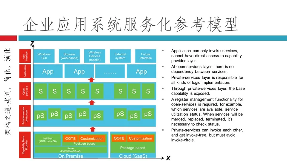 这是我们针对企业应用系统服务化而开发的模型,考虑了多种逻辑和物理架构。结合企业应用,基于多层分布式体系结构而进行的实例化。我们希望该模型能够覆盖企业的全部应用,包括基于package的二次开发系统(如SAP,Oracle),基于SaaS的云应用(如SFDC),以及基于Java/.Net自开发的一些应用。我们正在实践中逐步完善这个模型,希望能为企业架构的优化助力。