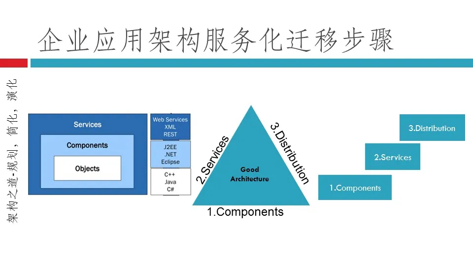 通过前面的痛点及解决方案的分析,我们总结了好的企业应用架构的三要素,同时也作为我们的三步走战略:
