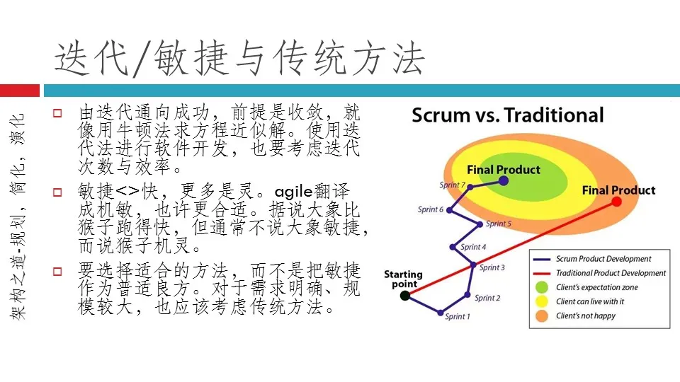 如前面所阐述,迭代是有条件的。我的建议是:在有规划的基础上进行演化。我们无法得到普适的架构,但可以得到确定领域的通用架构,可以在特定领域通过演化使应用架构逐步优化,逐步与业务架构想适应,提高匹配度。