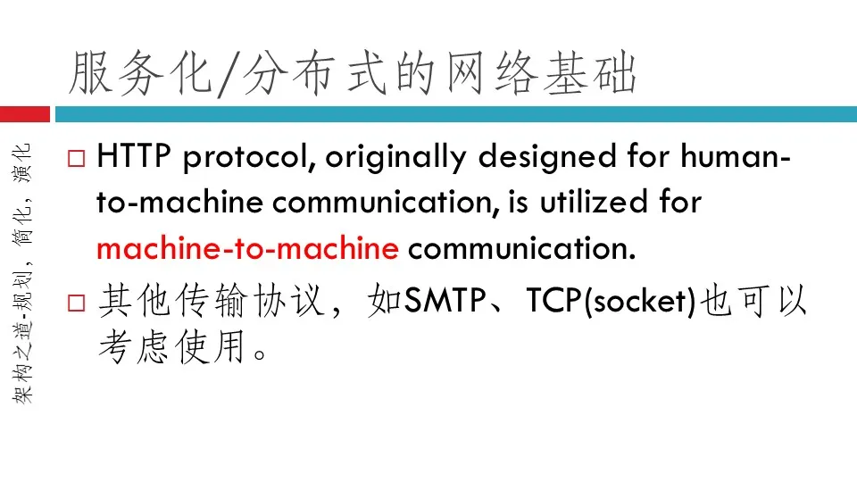 无论服务化还是分布式,都需要进程间通讯(IPC),也包括线程间的通讯。这样,一个好的通讯协议是必要的。HTTP协议的设计初衷据说是为了人-机通讯,后来被用作机器间通讯(M2M),这是服务化/分布式的网络基础。