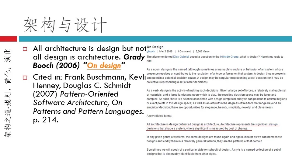第一、这个概念来自于建筑工程领域,要深入准确地理解,需要看一些建筑方面的资料,比如我会看梁思成《图像中国建筑史》手绘图,从中体会什么是架构;我也会到建筑工地去看建筑施工的一些情况;还会在旅游时有意识地关注不同样式的建筑,体会其架构的不同。“建筑是凝固的音乐”,我们要试图体会架构之美。