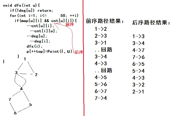 1 /* 2 题意:打印欧拉回路! 3 思路:开始时不明白,dfs为什么是后序遍历? 4 因为欧拉回路本身是一条回路,那么我们在dfs时,可能存在提前找到回路,这条回路可能不是欧拉回路, 5 因为没有遍历完成所有的边!如果写成前序遍历的话,存储起来的路径就不是一条完整的路径了!它有可能 6 是多条回路组成的!答案就是错误 的!如果是后序遍历的话,当dfs是遇到了回路,那么就退出当前栈的搜索! 7 去寻找其他的路径!最终得到的只有一条回路路径!-->欧拉回路~! 8 */ 9 #include<iostream> 10 #include<cstring> 11 #define M 55 12 #define Max 0x3f3f3f3f 13 using namespace std; 14 15 int cnt[M][M]; 16 int deg[M]; 17 int map[M][M]; 18 int x; 19 20 struct Point{ 21 int x, y; 22 Point(){} 23 24 Point(int x, int y){ 25 this->x=x; 26 this->y=y; 27 } 28 }; 29 30 Point p[1005]; 31 int top; 32 33 void dfs(int u){ 34 if(!deg[u]) return; 35 for(int i=1; i<=50; ++i) 36 if(map[u][i] && cnt[u][i]){ 37 --cnt[u][i]; 38 --cnt[i][u]; 39 --deg[u]; 40 --deg[i]; 41 dfs(i); 42 p[++top]=Point(u, i); 43 } 44 } 45 46 int main(){ 47 int t, n, k=0; 48 cin>>t; 49 while(t--){ 50 cin>>n; 51 x=Max; 52 memset(cnt, 0, sizeof(cnt)); 53 memset(map, 0, sizeof(map)); 54 memset(deg, 0, sizeof(deg)); 55 for(int i=1; i<=n; ++i){ 56 int u, v; 57 cin>>u>>v; 58 deg[u]++; 59 deg[v]++; 60 map[u][v]=1; 61 map[v][u]=1; 62 cnt[u][v]++; 63 cnt[v][u]++; 64 if(x>u) x=u; 65 if(x>v) x=v; 66 } 67 int ok=0; 68 for(int i=1; i<=50; ++i) 69 if(deg[i]%2!=0){ 70 ok=1; 71 break; 72 } 73 cout<<"Case #"<<++k<<endl; 74 if(ok){ 75 cout<<"some beads may be lost"<<endl; 76 if(t) cout<<endl; 77 continue; 78 } 79 top=0; 80 dfs(x); 81 if(top==n){ 82 for(top; top>=1; --top) 83 cout<<p[top].x<<" "<<p[top].y<<endl; 84 } 85 else cout<<"some beads may be lost"<<endl; 86 if(t) cout<<endl; 87 } 88 return 0; 89 }