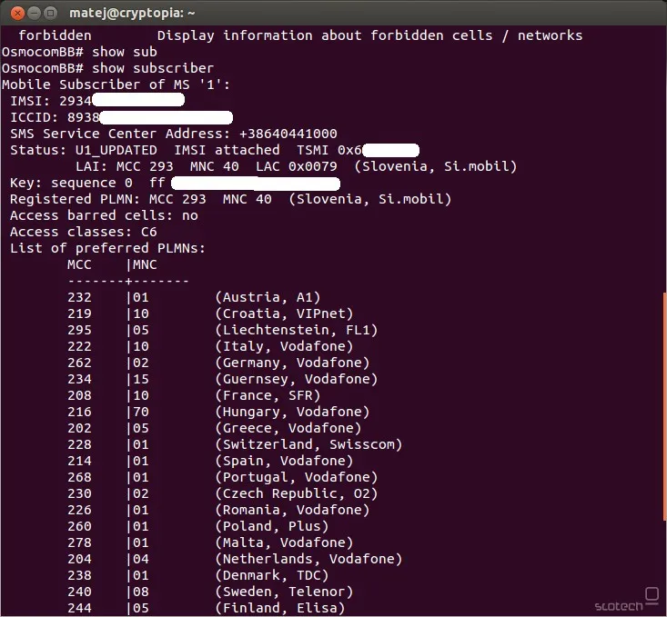OsmocomBB# show subscriber Mobile Subscriber of MS '1': IMSI: 2934*********** ICCID: 8938640************* SMS Service Center Address: +38640441000 Status: U1_UPDATED IMSI attached TMSI 0x65****** LAI: MCC 293 MNC 40 LAC 0x0079 (Slovenia, Si.mobil) Key: sequence 0 ** c5 ** ** ** ** 4c ** Registered PLMN: MCC 293 MNC 40 (Slovenia, Si.mobil) Access barred cells: no Access classes: C6 List of preferred PLMNs: <p>…</p>