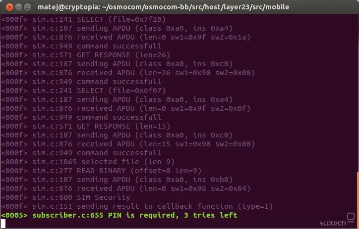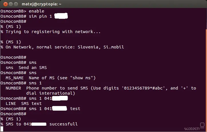 Trying 127.0.0.1... Connected to localhost. Escape character is '^]'. Welcome to the OpenBSC Control interface OsmocomBB> enable OsmocomBB# sim pin 1 1234 % (MS 1) % Trying to registering with network... % (MS 1) % On Network, normal service: Slovenia, Si.mobil