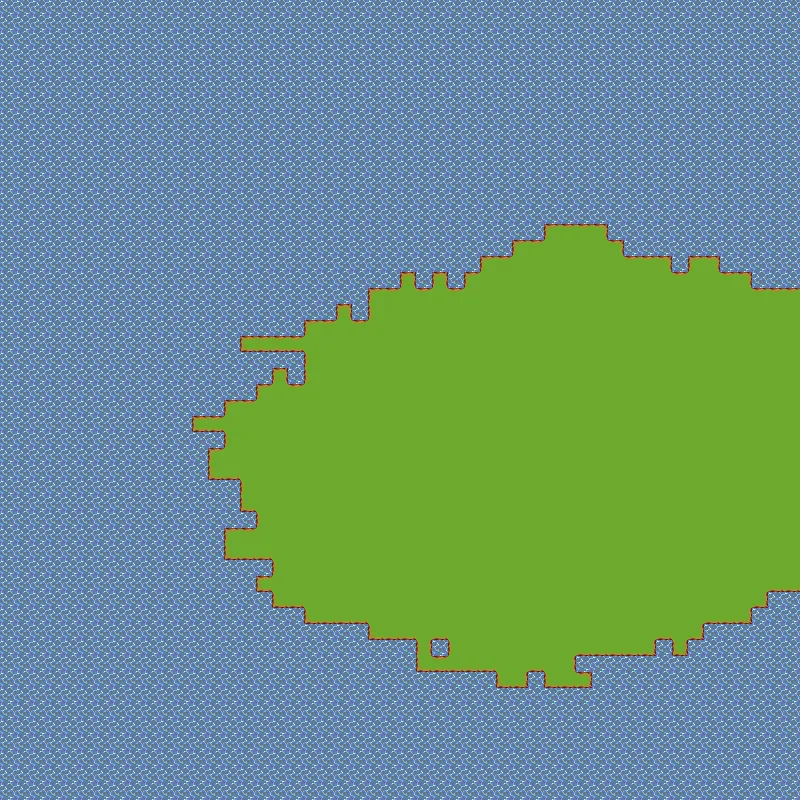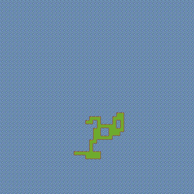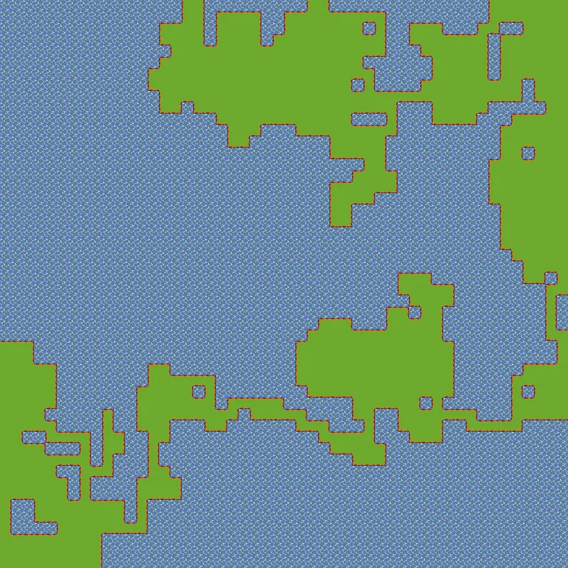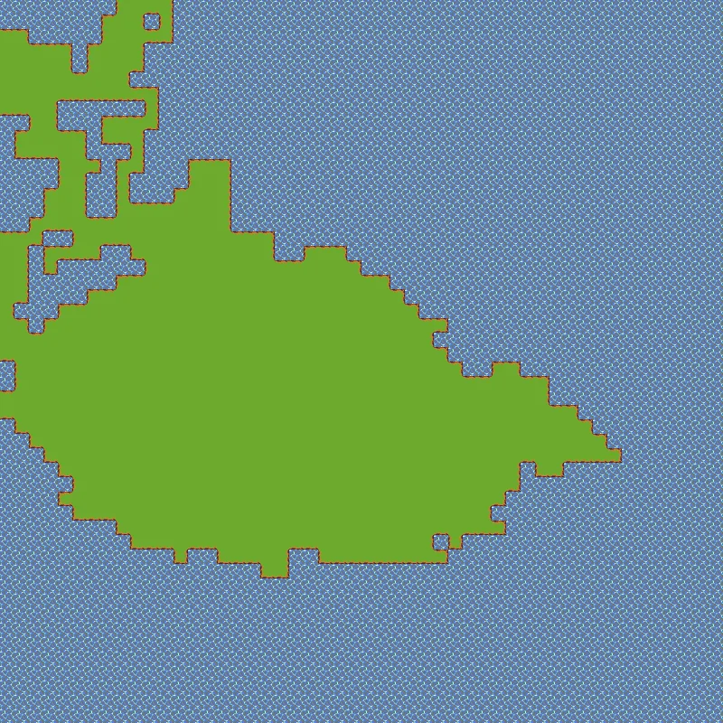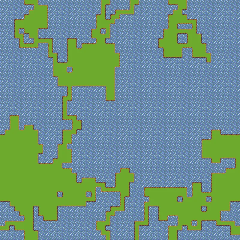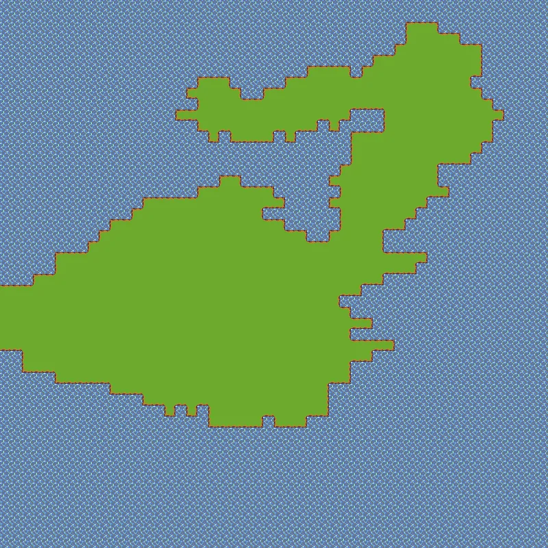 50x50 填充 800 胖胖的区域 50x50 填充 50 胖胖的区域显而易见,跟之前 DFS 生成出来的奇形怪状相比,这种算法生成的连通区域更像是一块 Mainland,而前者则更像是一个洼地沼泽或者丛林。