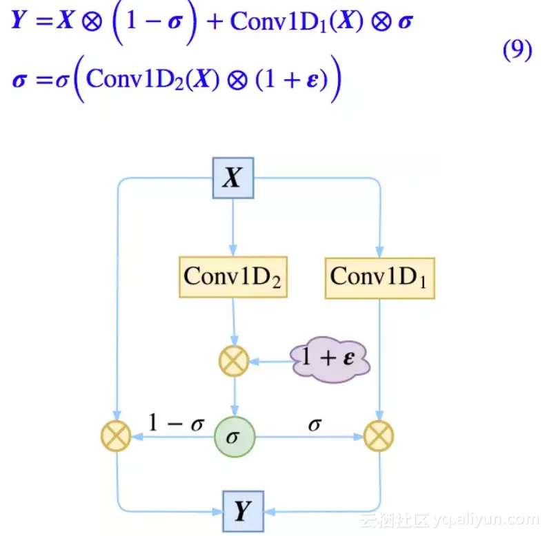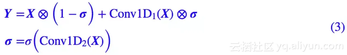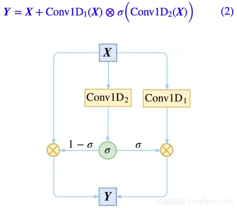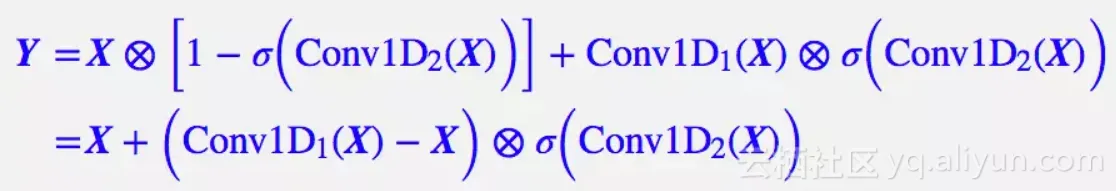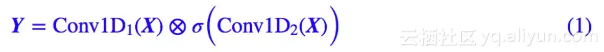 注意这里的两个 Conv1D 形式一样(比如卷积核数、窗口大小都一样),但权值是不共享的,也就是说参数翻倍了,其中一个用 sigmoid 函数激活,另外一个不加激活函数,然后将它们逐位相乘。