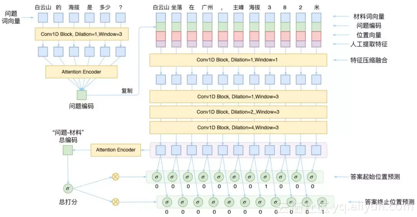 这时候我们得到了一个混合了问题、材料信息的特征序列,直接对这个序列进行处理即可,所以后面接了几层卷积进行编码处理,然后直接对序列进行标注,而不需要再对问题进行交互了