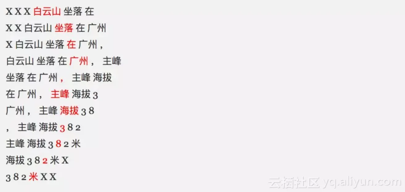 比如问题“白云山 的 海拔 是 多少 ?”,材料“白云山 坐落 在 广州 , 主峰 海拔 3 8 2 米”。问题有 6 个词,那么窗口大小就为 6,将材料拆分为:
