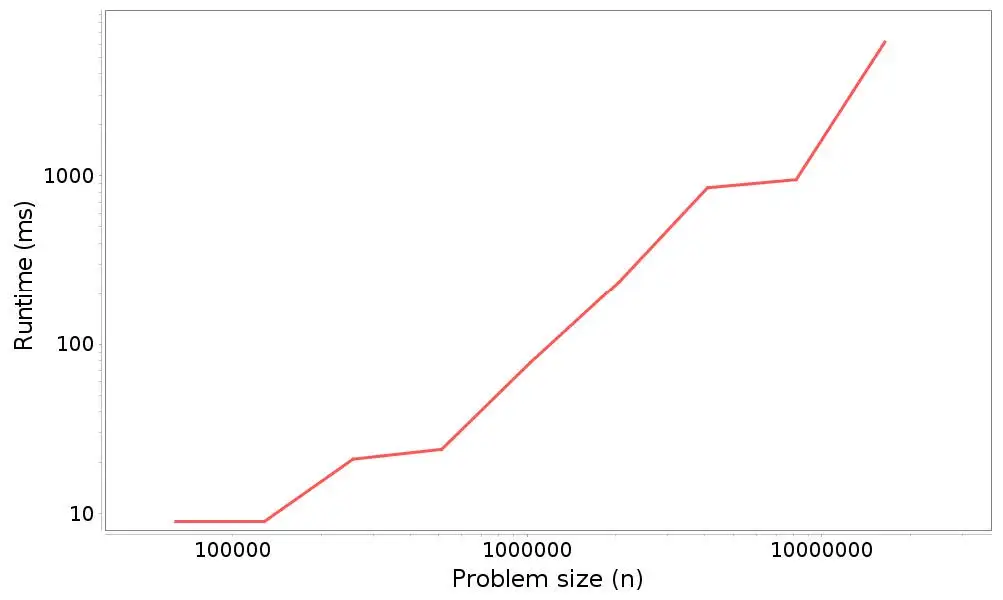以下是时间结果(左侧是问题规模,右侧是运行时间,单位为毫秒):
