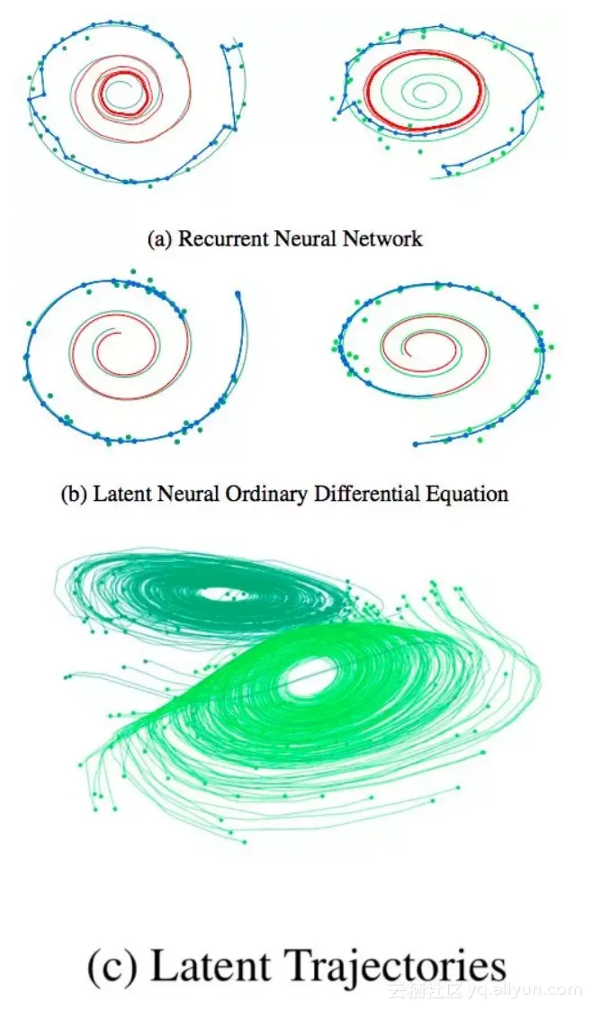 还有时间连续RNN(continuous-time RNNs),能够处理不规则的观察时间,同时用状态依赖的泊松过程近似建模。下图展示了普通的RNN和神经ODE对比: