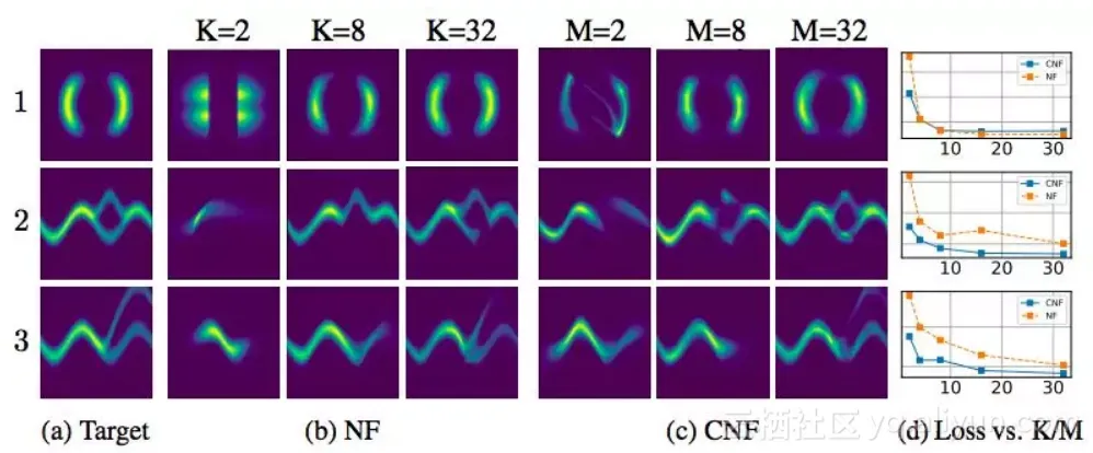 标准化流与连续标准化流量的比较。标准化流的模型容量由网络的深度(K)决定,而连续标准化流的模型容量可以通过增加宽度(M)来增加,使它们更容易训练。来源:研究论文