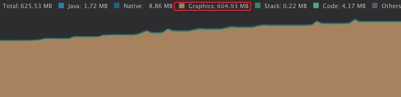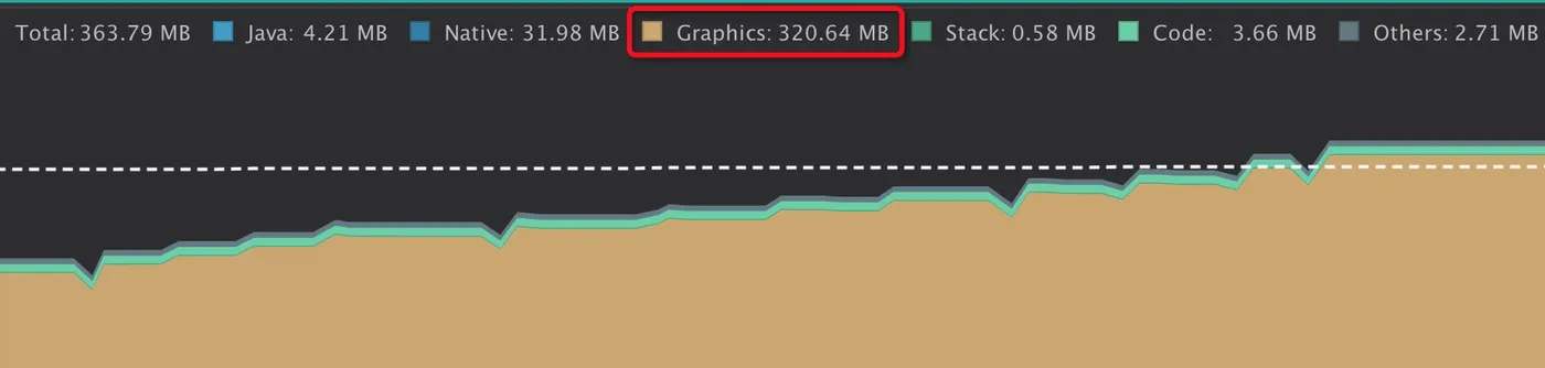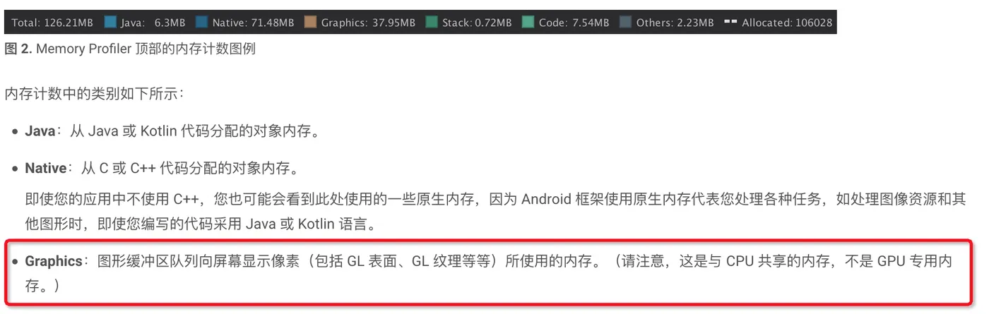 可以看到,Flutter Image使用的内存既不属于Java虚拟机内存也不属于Native内存,而是Graphics内存(在Meizu pro5设备上也不属于Graphics,事实上Meizu pro5设备不能归类Flutter Image所使用的内存),官方对Graphics内存的解释是: