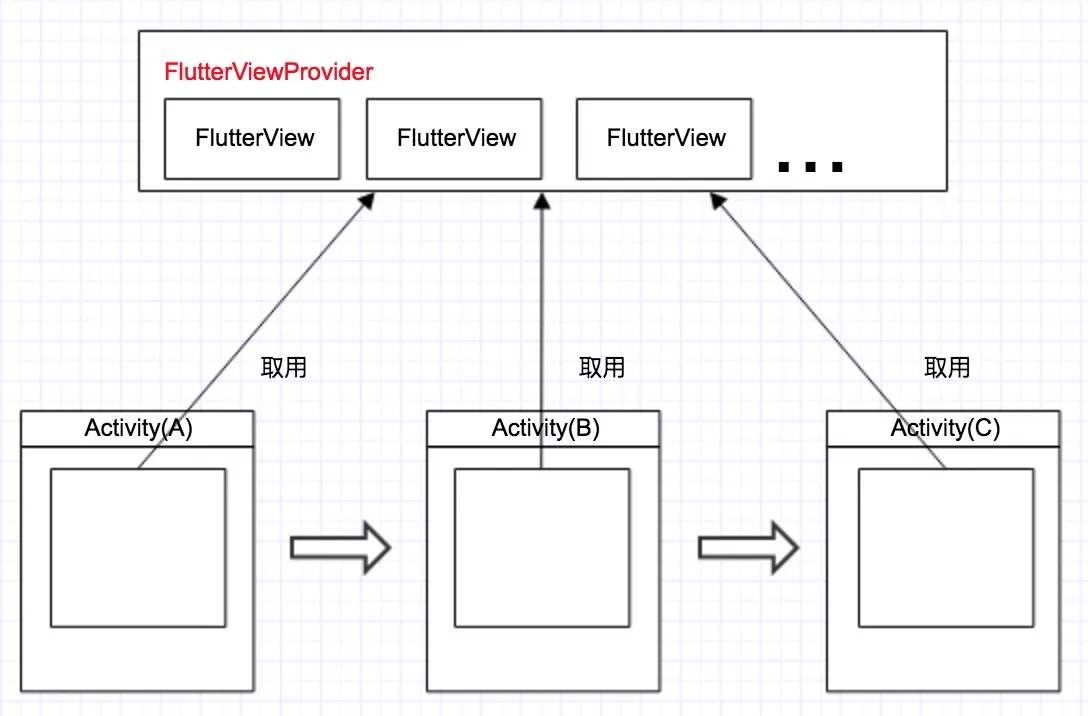 FlutterView复用与否不是绝对的,有时候可以使用一些综合性折中方案,比如,我们可以建立一个FlutterViewProvider,里面维护N个可复用的FlutterView,如图: