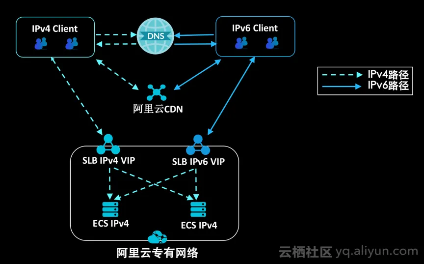 传统的负载均衡只提供IPv4的访问能力,且后端通过v4方式访问后端服务器。鉴于第一期VPC和ECS等核心组建不具备IPv6能力条件下,采用先将暴露给客户的公网侧进行v6改造的方案。