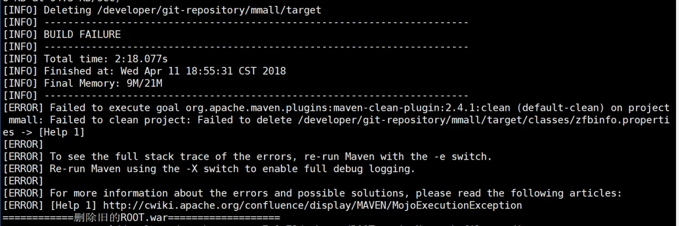 今天在linux下创建了一个项目自动化发布的脚本,在执行到 mvn clean package -Dmaven.test.skip=true 的时候,项目clean失败