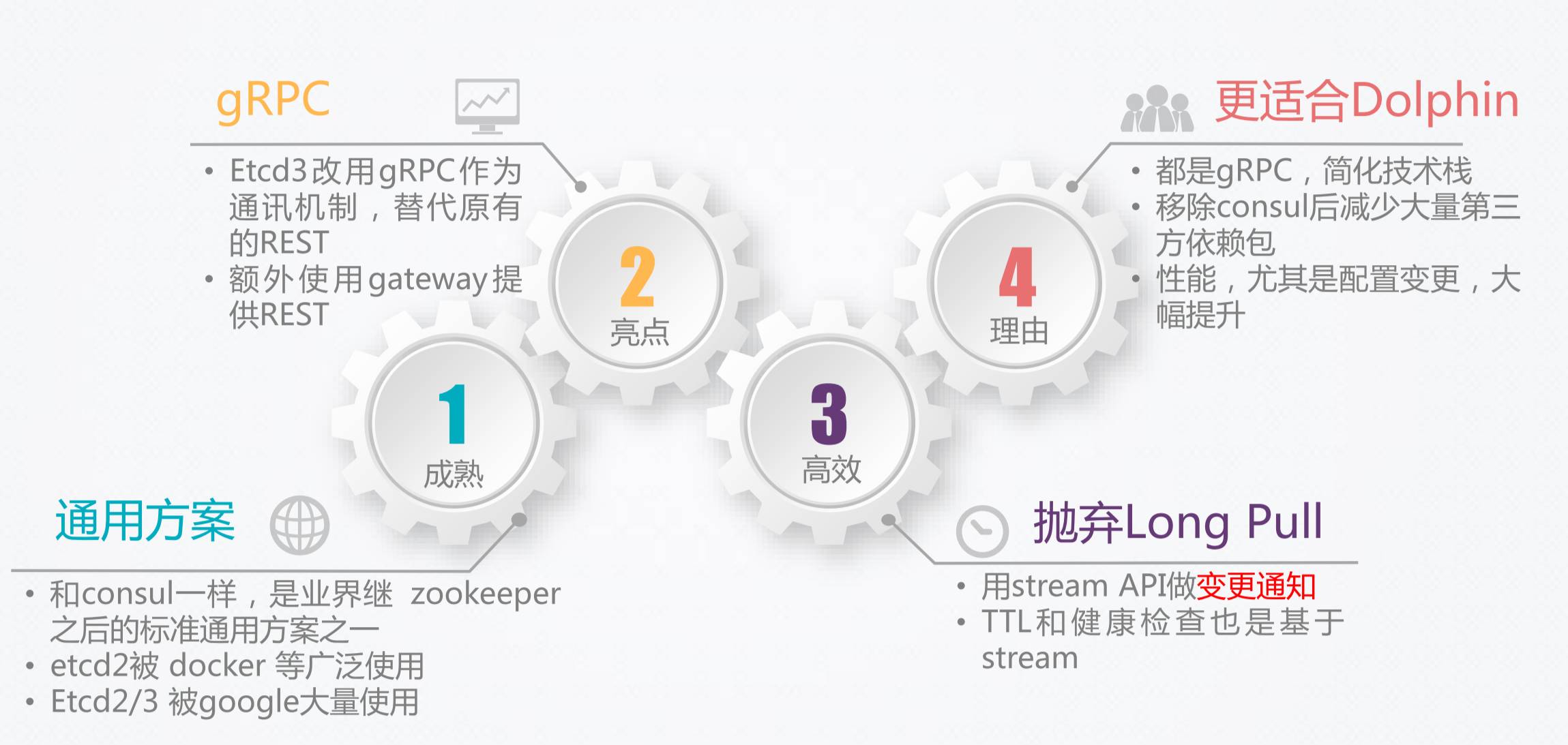 实际上Dolphin做到0.1、0.2到0.5,一直用的都是Consul,最近我们决定把它换过来,因为Etcd3给了我们一个很大的惊喜,它的通讯机制改了,Etcd3改用gRPC作为通讯机制,替代原有的rest。