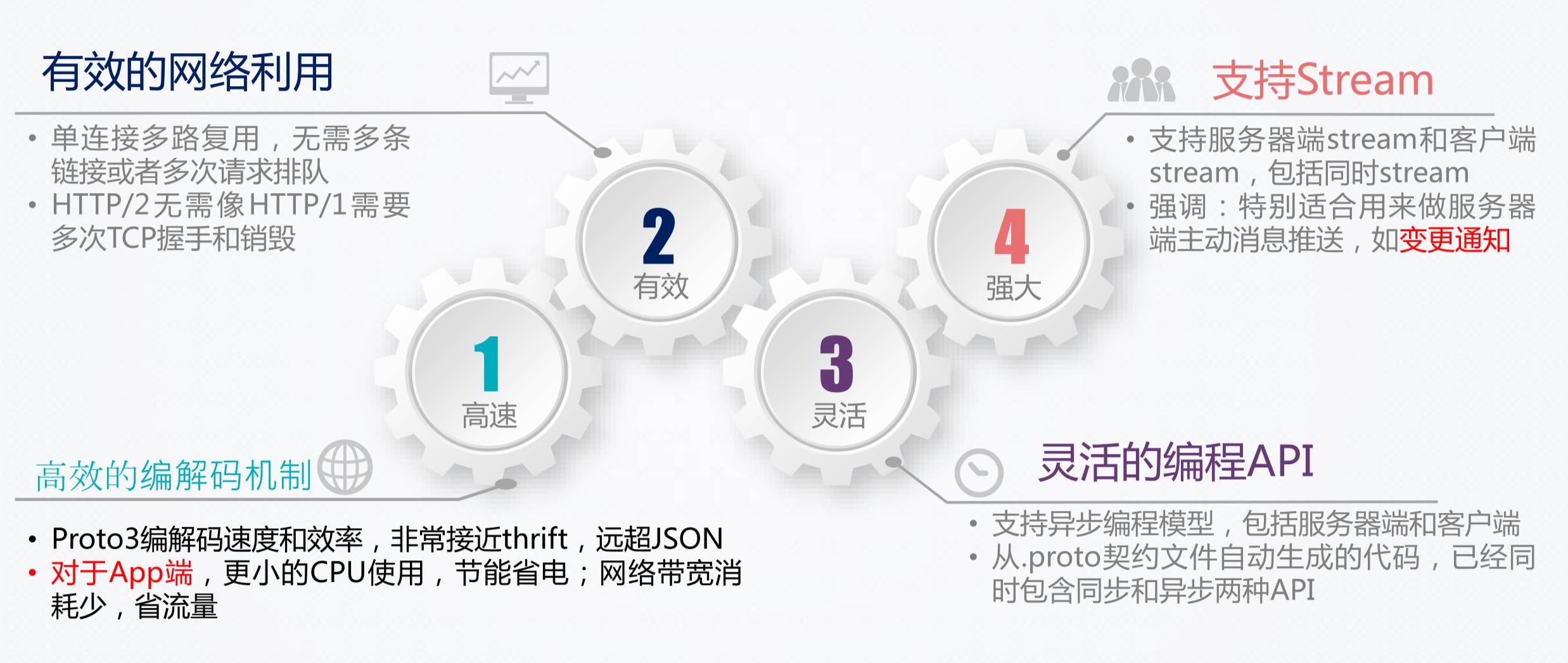 gPRC的主要特性有哪些呢?首先它可以有效提高网络利用,其次就是高效编解码机制、灵活的编程API。重要的是它支持stream。