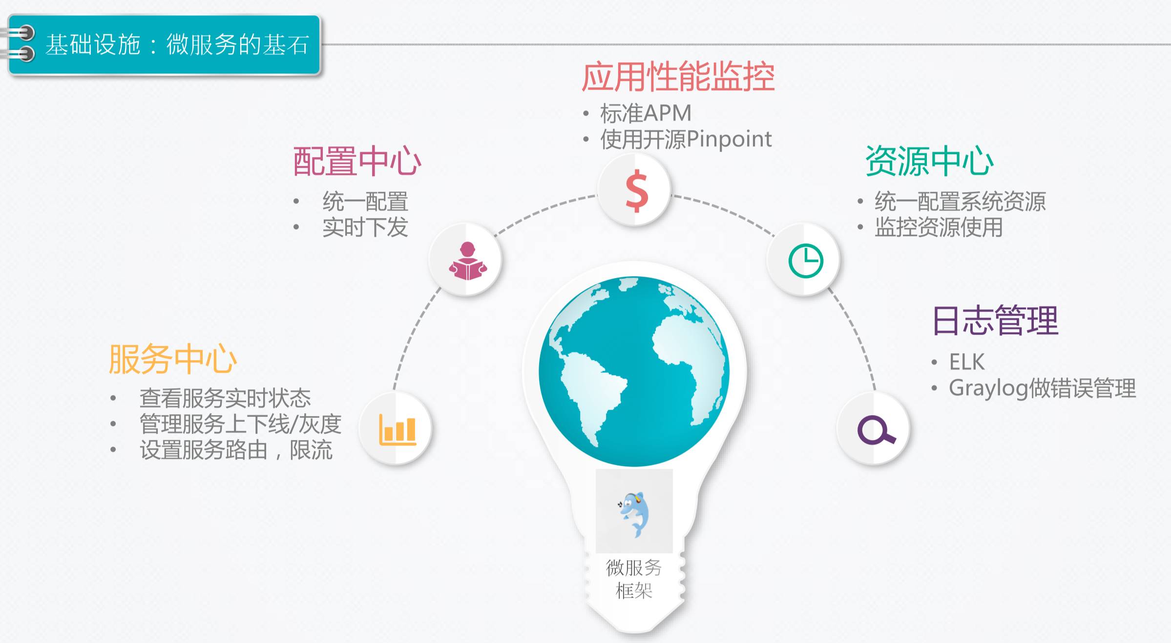 你要推行一个微服务框架的时候,要把这些东西通通跑通,而且做顺、做好,你的微服务框架才能真正落到实处。如果有一个卡住你,你就会发现走的时候就感觉是瘸了腿的感觉。
