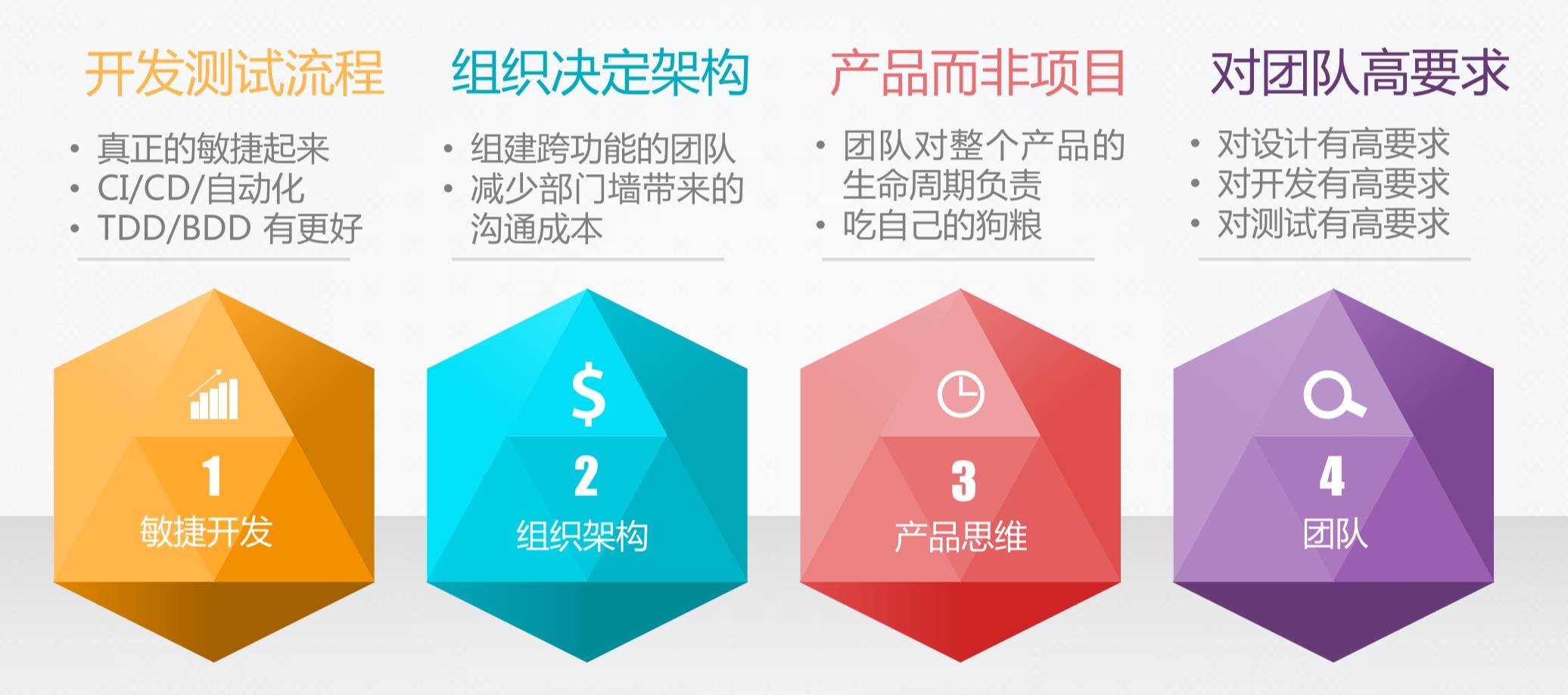 比方说敏捷开发。敏捷开发这个是必备的,如果是敏捷都没有做到,微服务真的是“连爬都还不会就想跑”。有时候微服务一上手发现不合适了,做这个东西之前先自问一下,你的敏捷开发是不是跑起来了,你的团队是不是用敏捷的方式做开发。