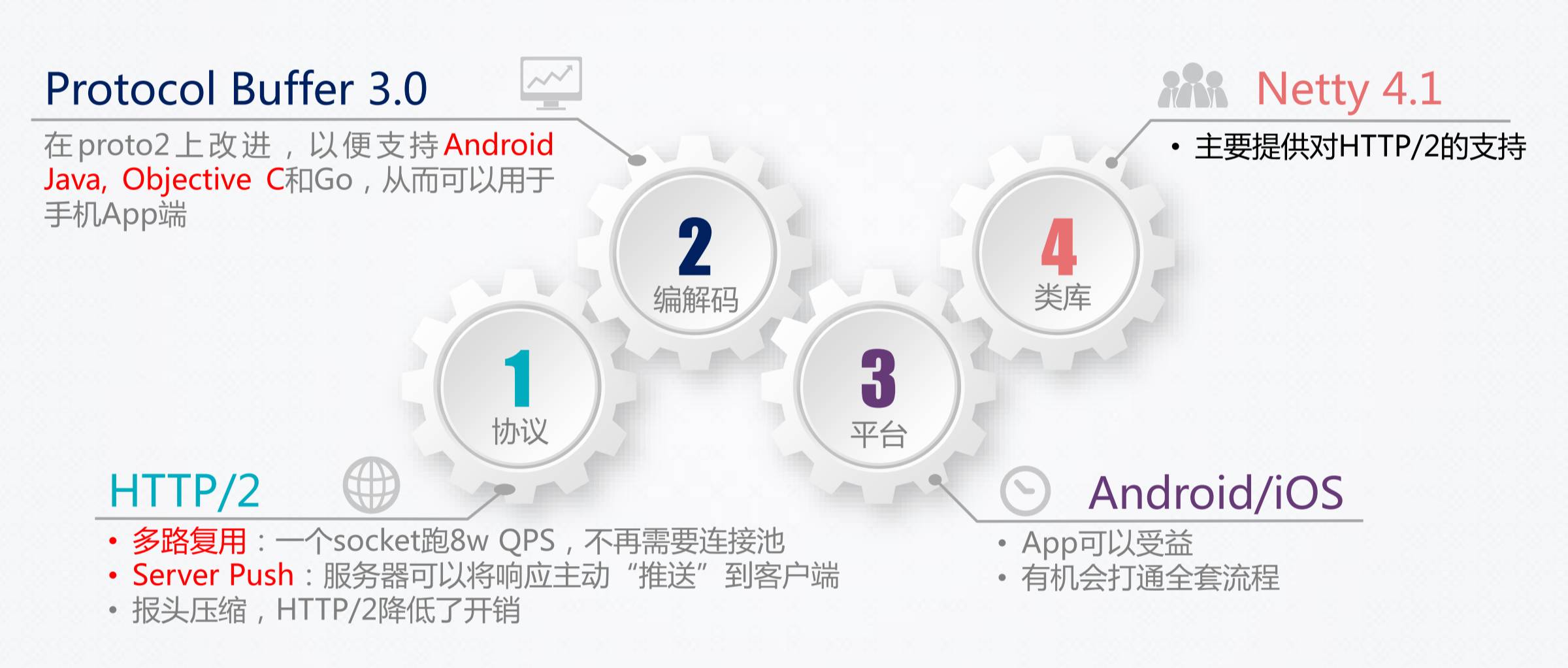 这个Protocol Buffer3.0版本是比较新的一个版本。gPRC一个重要的地方就是HTTP/2 协议,不算是特别的新,但是大家真正用的比较少。HTTP/2是一个新的技术,很重要的一个事情是多路复用。同时Server Push能够让服务器将响应主动“推送”到客户端。Server push这个功能,非常非常有用,由于时间原因不再展开。