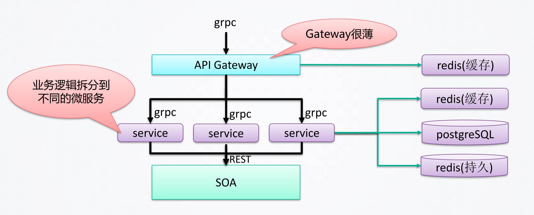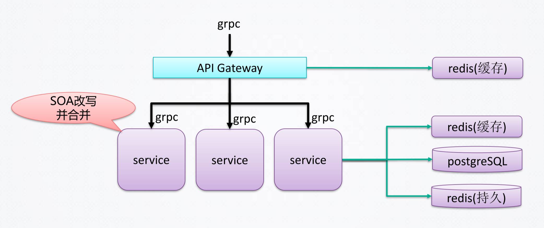 拆到这一步之后,再下一步,把原来的SOA合进来,然后变成一个一个的完整的微服务。这才是App的后台的标准框架。