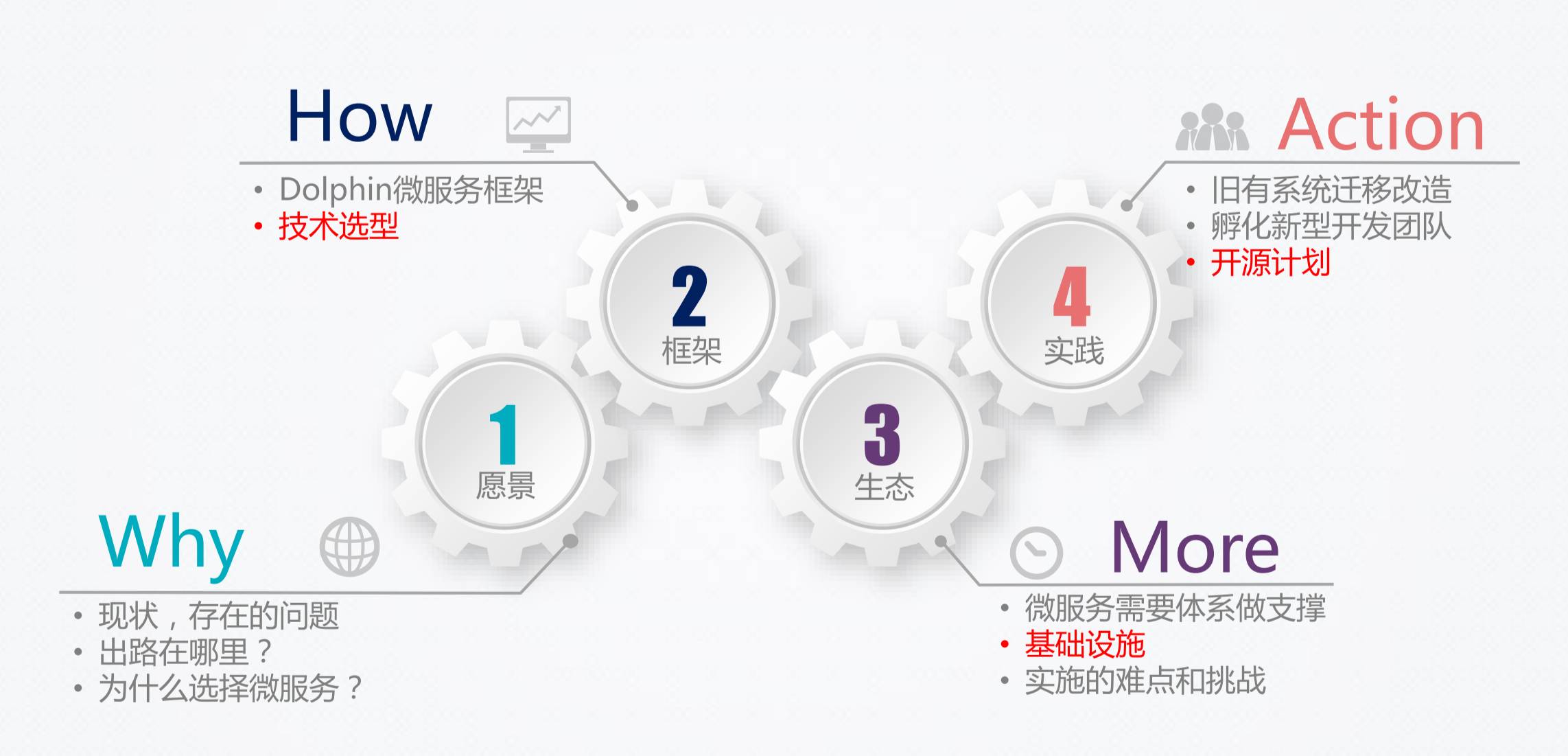 这一整套四个大方案,是我们希望解决前面问题的一些出发点和做法。DevOps和每日发布是我们的目标。第一部分大概就是在这里,就是我们处于什么状态,为什么要上微服务。