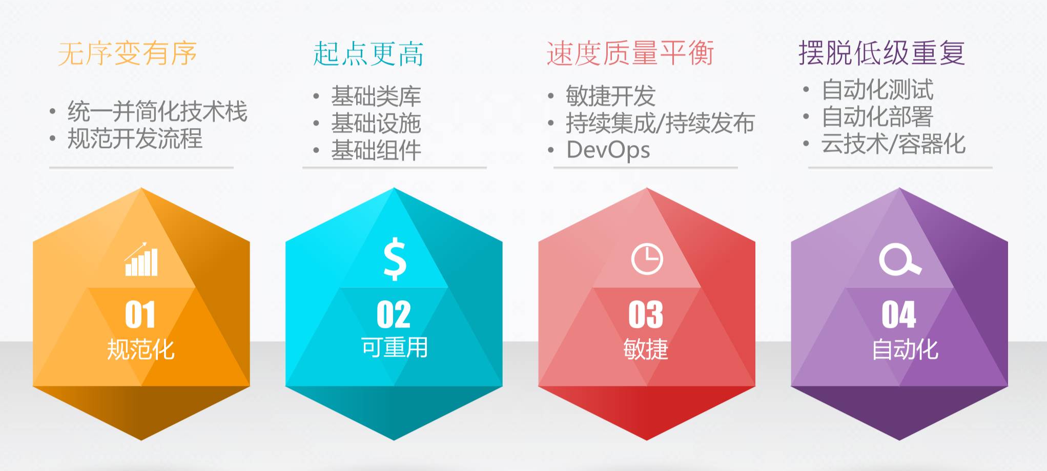 第二个就是要“可重用”。之前的项目都是从头开始或者是从上一个项目里头copy过来,这里面是有很多事情没有做好的:基础类库、基础设施、基础架构。做这些最终的目标是提升大家的起点,而我们经常说的一句话就是说不要输在起跑线上。