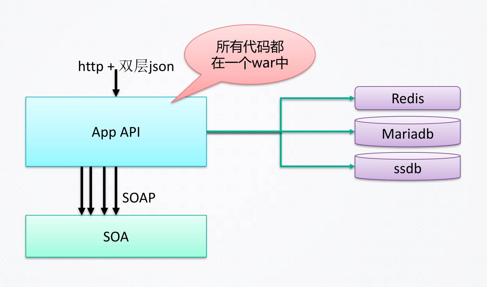 现在理财App带来了80%的收入,App后台架构一目了然,底层有一个SOA框架,但是最要命是整个App的后台,所有代码都在一个WAR中。