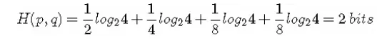 (因为用 q(x) 来编码的样本来自于分布 q(x) ,所以 H(p,q) 中的概率是 p(x))。此时就将 H(p,q) 称之为交叉熵。举个例子。考虑一个随机变量 x,真实分布p(x)=(1/2,1/4,1/8,1/8),非真实分布 q(x)=(1/4,1/4,1/4,1/4), 则H(p)=1.75 bits(最短平均码长),交叉熵:
