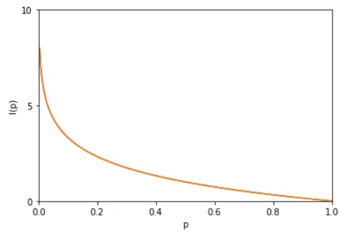 其中负号是用来保证信息量是正数或者零。而 log 函数基的选择是任意的(信息论中基常常选择为2,因此信息的单位为比特bits;而机器学习中基常常选择为自然常数,因此单位常常被称为奈特nats)。I(x) 也被称为随机变量 x 的 自信息 (self-information),描述的是随机变量的某个事件发生所带来的信息量。图像如图: