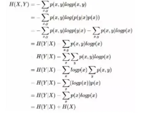 条件熵 H(Y|X)相当于联合熵 H(X,Y)减去单独的熵 H(X),即H(Y|X)=H(X,Y)−H(X),证明如下:
