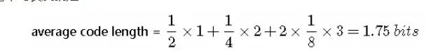 我们可以看到,非均匀分布比均匀分布的熵要小。现在让我们考虑如何把变量状态的类别传递给接收者。与之前一样,我们可以使用一个2比特的数字来完成这件事情。然而,我们可以利用非均匀分布这个特点,使用更短的编码来描述更可能的事件,使用更长的编码来描述不太可能的事件。我们希望这样做能够得到一个更短的平均编码长度。我们可以使用下面的编码串(哈夫曼编码):0、10、110、111来表示状态 {a,b,c,d}。传输的编码的平均长度就是: