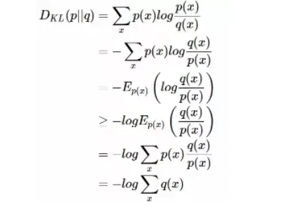 DKL(p||q)≥0证明如下:(用Jensen不等式https://en.wikipedia.org/wiki/Jensen%27s_inequality)