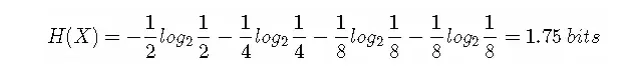那么这些定义有着什么样的性质呢?考虑一个随机变量 x。这个随机变量有4种可能的状态,每个状态都是等可能的。为了把 x 的值传给接收者,我们需要传输2比特的消息。H(X)=−4×(1/4)log2(1/4)=2 bits。现在考虑一个具有4种可能的状态 {a,b,c,d} 的随机变量,每个状态各自的概率为 (1/2,1/4,1/8,1/8)。这种情形下的熵为: