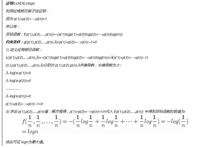 从公式可得,随机变量的取值个数越多,状态数也就越多,信息熵就越大,混乱程度就越大。当随机分布为均匀分布时,熵最大,且 0≤H(X)≤logn。稍后证明。将一维随机变量分布推广到多维随机变量分布,则其联合熵 (Joint entropy) 为: