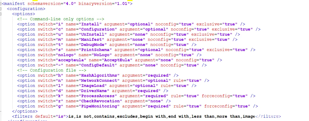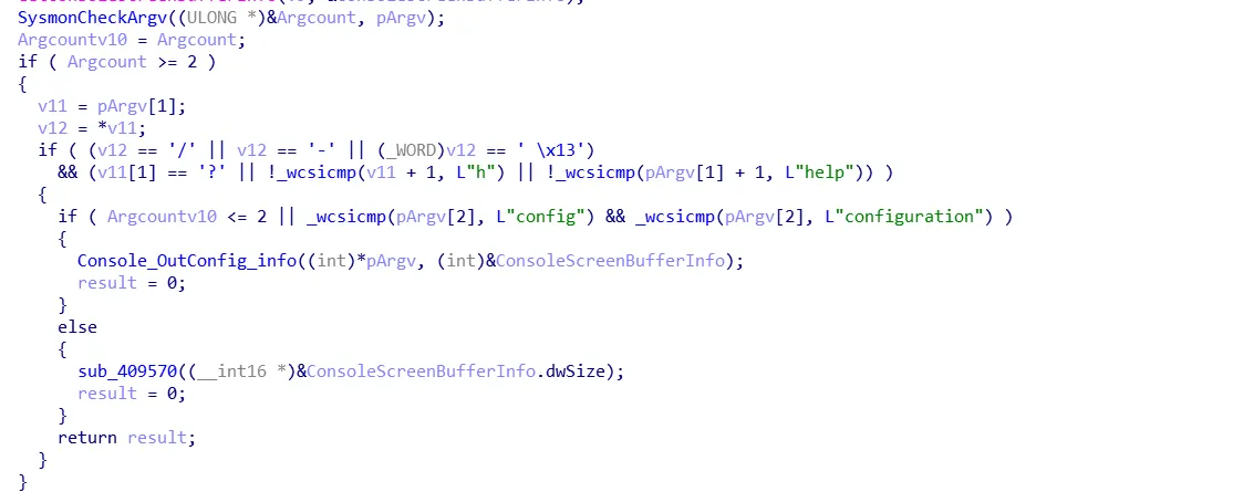 接下来sysmon会对参数进行检查,检查是否config、configuration、h、–nologon、?、help,非这些参数后,然后会接着解析具体的参数,根据参数是否加载规则。