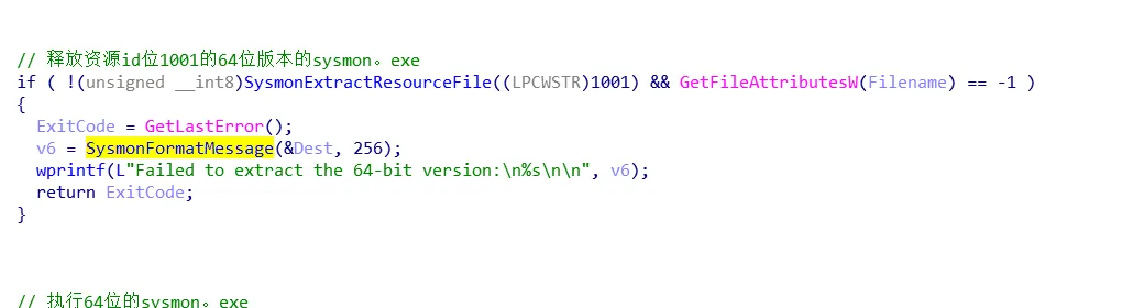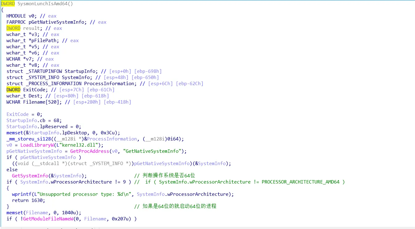 动态获取IsWow64Process的函数地址,然后调用IsWow64Process函数,判断当前是否是wow64,如果是就执行SysmonLunchIsAmd64(),进入SysmonLunchIsAmd64函数