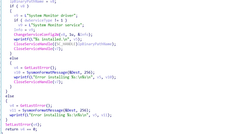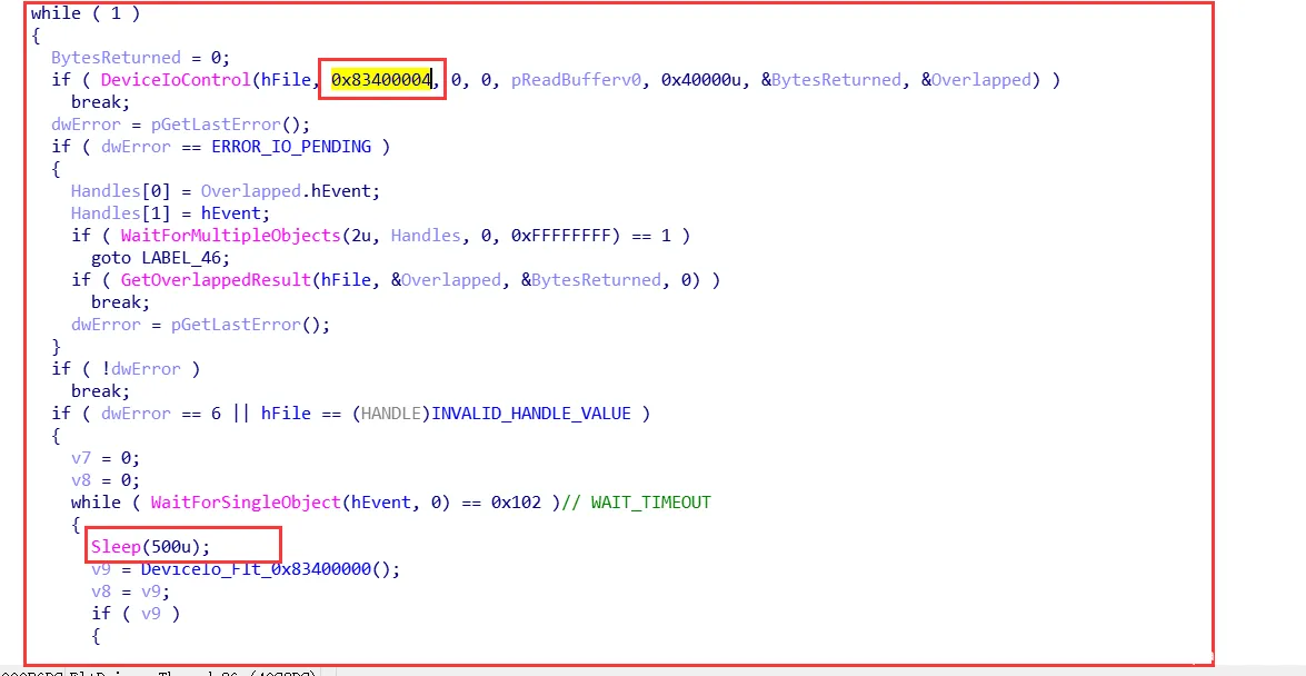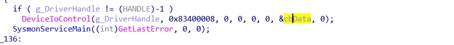 通过发送IO控制码: 0x83400000,打开文件驱动功能,接着sysmon会开启一个线程从驱动获取监控数据,通过发送IO控制码 :0x83400004,去反复获取