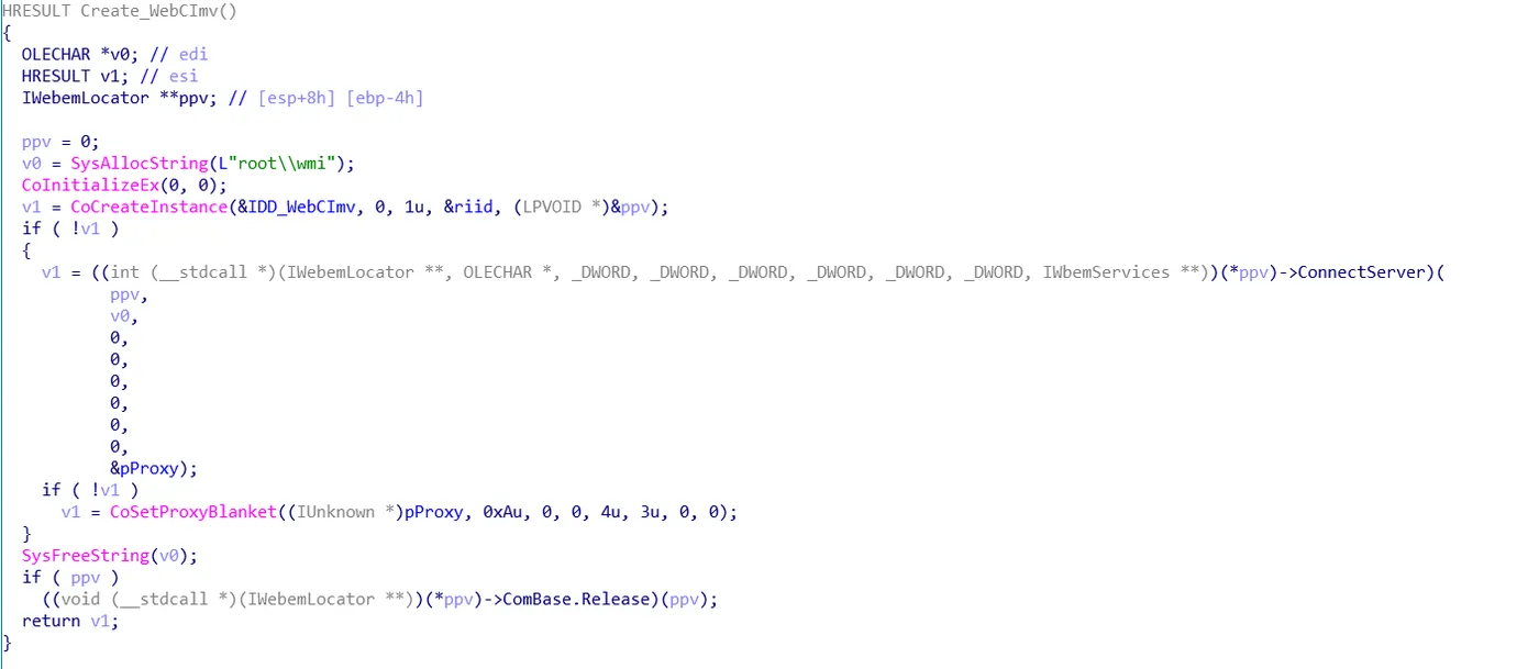 函数开头会创建实例IDD_WebCImv,class Id: IID_IWbemLocatorGUID2