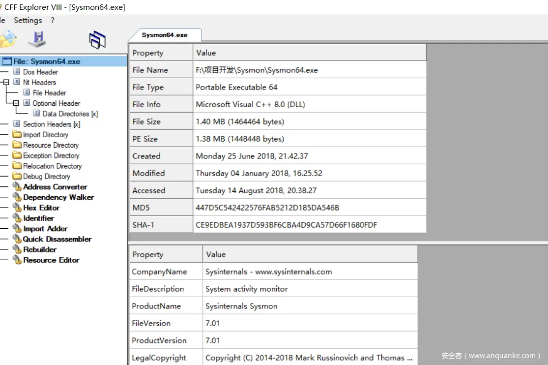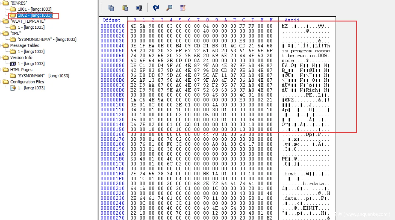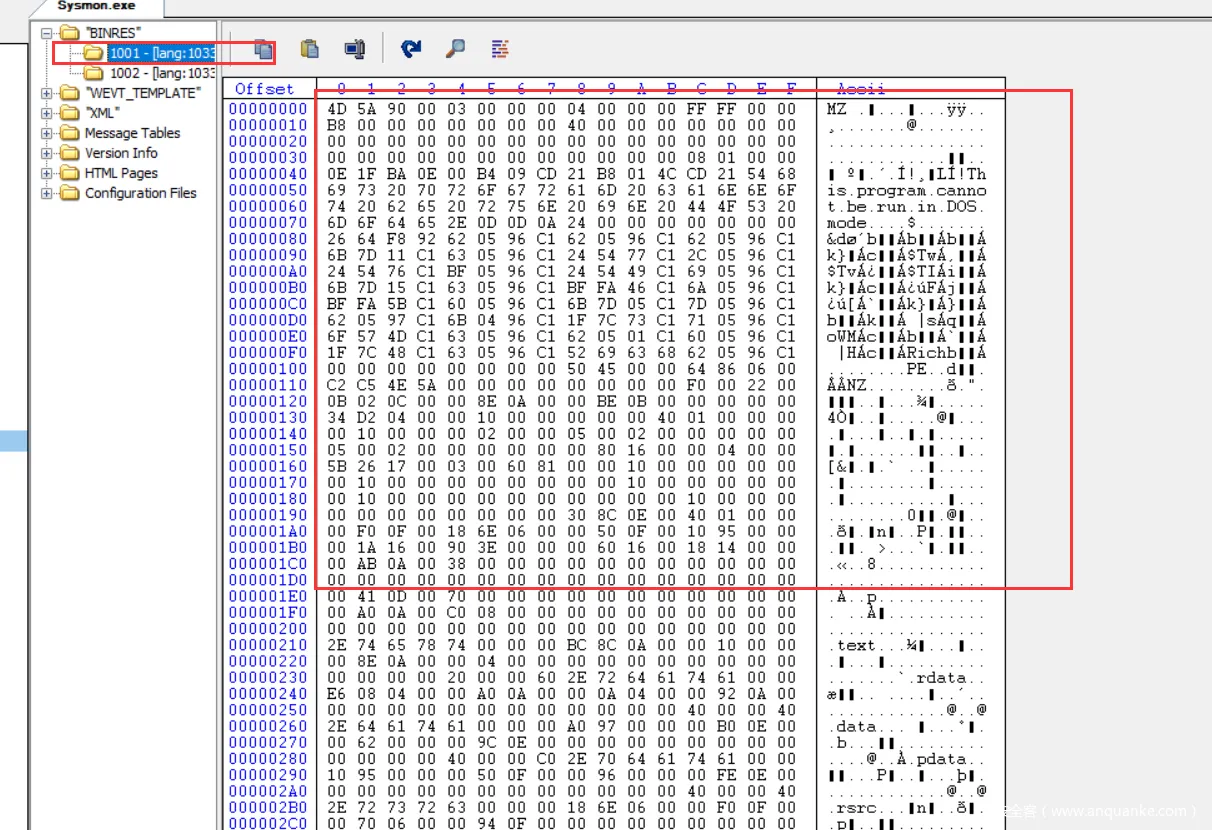 如果是PROCESSOR_ARCHITECTURE_AMD64则释放资源节中id = 1001的资源到当前进程的所在目录,这是一个内嵌在资源里的64位版本的sysmon的exe,释放完毕后,就开始执行这个64的Sysmon。下面就是Symon的64位资源图