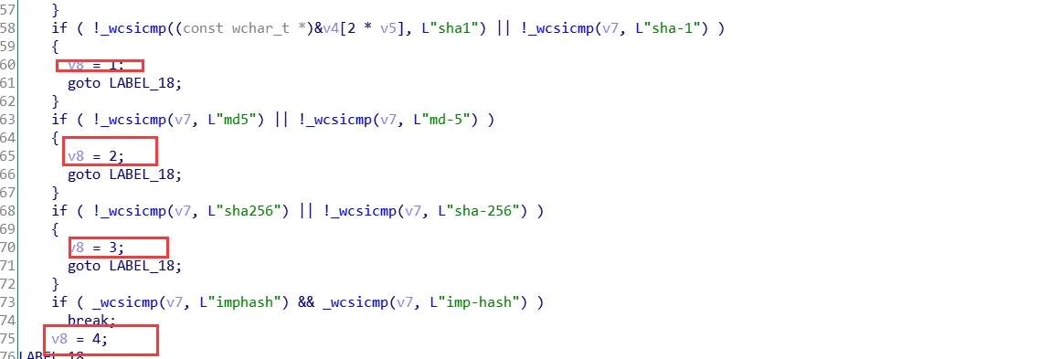 通过检测参数sha、sha-1、md5、md-5、sha、sha256、imphash、imp-hash计算当前使用何种hash算法