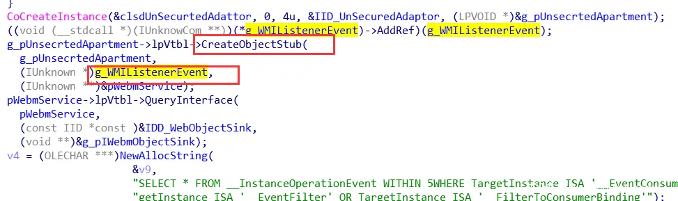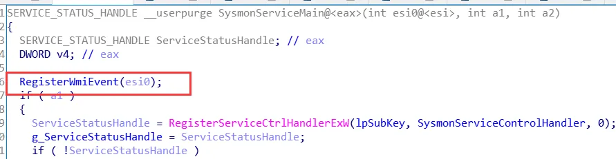 在之前的服务启动入口有一个函数RegisterWmiEvent,该函数就是注册过滤WmiEvent的函数,我们继续往下看