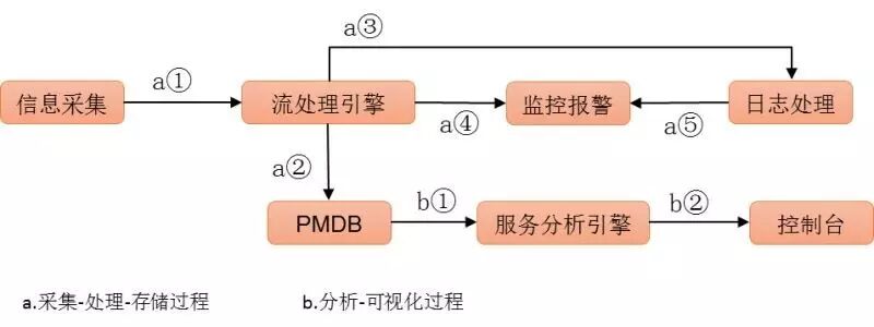 服务跟踪流程分为两个子过程:采集-处理-存储子过程和分析-可视化子过程,前者完成数据的采集、流式处理,以存储到PMDB和日志系统结束。后者基于存储的数据进行进一步的数据分析,完成容量预测、故障定位、关联度分析等高级功能,通过可视化界面对外呈现。整个流程如下图所示: