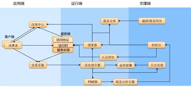 服务治理框架包括客户端框架、服务端框架、服务注册中心、采集器、流处理引擎、pmdb数据库、监控报警模块、认证授权模块、日志分析引擎、服务仓库、调度器、服务分析引擎、编排与服务网关、控制台。整体架构如图所示: