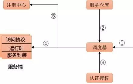 调度器根据管理员的指令从服务仓库中读取服务软件包和配置信息,结合管理人员给出的安全配置信息,根据既定的策略部署到目标环境;等待部署完成后,把服务名称、版本、上线时间、TTL、状态、优先级、角色、服务协议、服务IP/Port信息、服务命令及参数信息、访问路径、安全ACL等注册到注册中心中。整个流程如下图所示:
