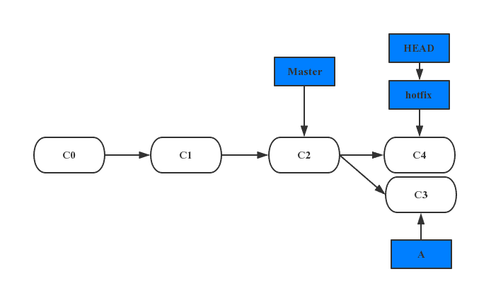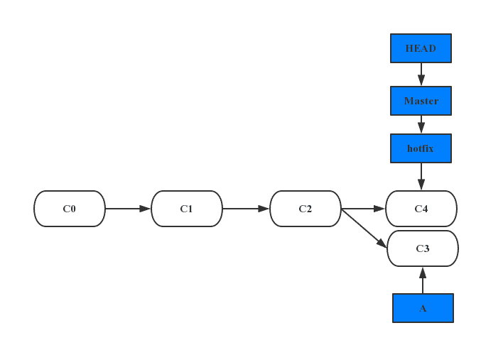 此时,在hotfix分支上所做的工作并没有包含到分支A中。 如果你需要拉取hotfix所做的修改,你可以使用git merge master命令将 master分支合并入A分支,或者你也可以等到A分支完成其使命,再将其合并回master分支。
