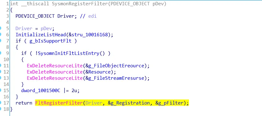 然后根据操作系统是否支持FltRegisterFilter(Driver, &g_Registration, &g_pFilter);