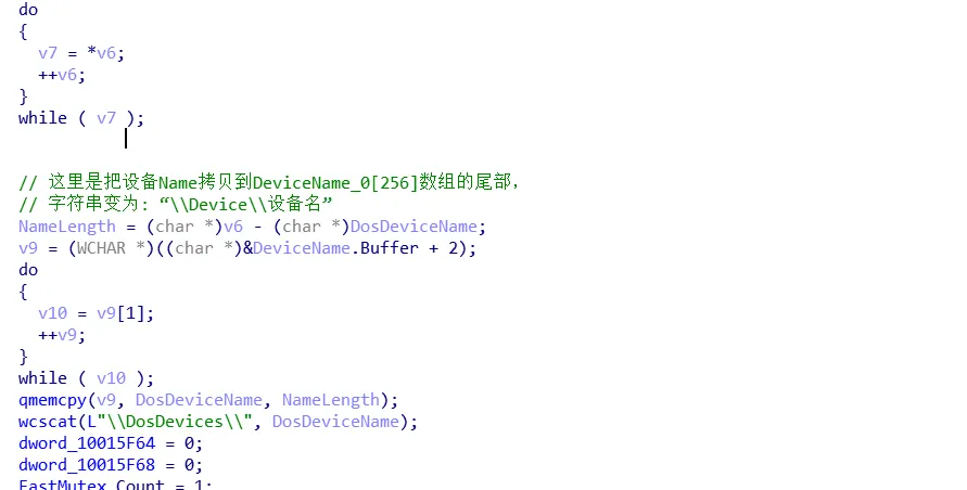 从DriverEntry(PDRIVER_OBJECT DriverObject, UNICODE_STRING *pRegistry)的pRegistry中截取末尾名称去获取并计算出设备名和DosDevices的名字。