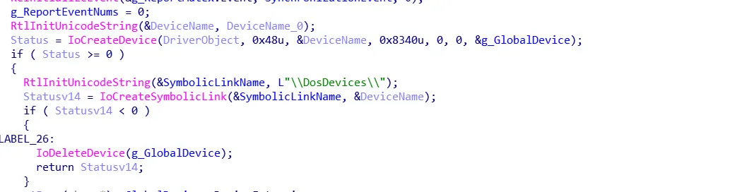 然后就是常规过程,IoCreateDevice、IoCreateSymbolicLink。