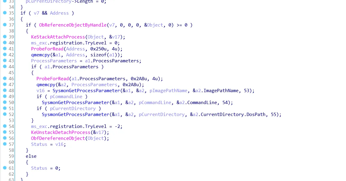 大致可以看到如下,首先要KeStackAttachProcess进程的空间,然后获取PEB地址,从PEB中的到ProcessParameters的结构